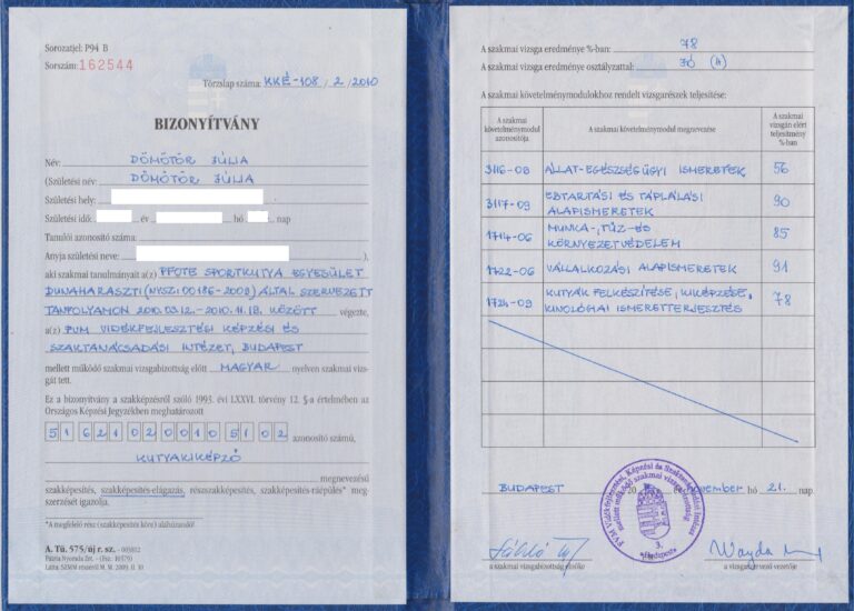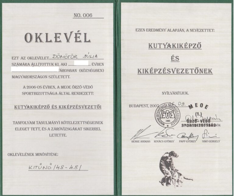 nagy álmom valósult meg. Édesapámnak köszönhetően, az akkor már 2,5 éves dobermannommal, részt vettem a Népszigeti Kutyaiskola egy hetes nyári Kutyakiképző és kiképzésvezető tanfolyamán. A képzés végén vizsgáznunk kellett a sárga diplomáért, melyet egy év múltán, újabb egy hetes tanulás végén kellett „megvédeni”. Sohasem felejtem, Dr. Kováts Zsolt előadásait – és azóta ügyfeleimnek is idézett – mondását: „A kutya dolgai nem az ember dolgai és az ember dolgai nem a kutya dolgai”. Nagy bölcsesség ez, melyet manapság teljesen figyelmen kívül hagyunk.