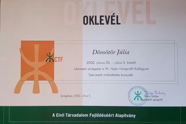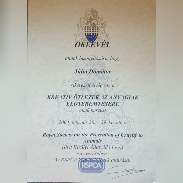 Az angliai királyi állatvédő szervezet tanfolyamán megtanultam projektben gondolkodni, hatékonynak lenni, minőségi munkára törekedni. Mind a képzés, mind az oktatók szintén nagy hatású, meghatározó élményt jelentettek.