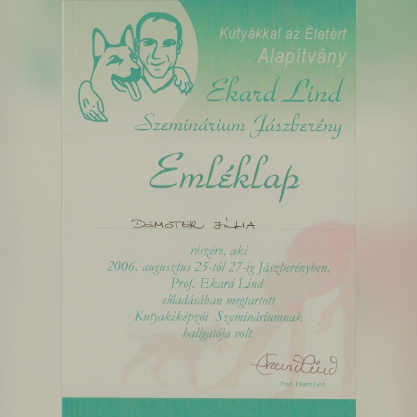 Ekard Lind nagyon érdekes, kutyával együtt táncolás és engedelmességi képzési technikákat tanított nekünk. Kétségtelen, mindezt olyan magas fokon űzte, ami csak tudatos, fejlett és áramvonalasan összeszokott gazda-kutya kapcsolatban valósítható meg. Nem elvárásokkal volt a kutyái felé, hanem elmagyarázva segítette őket a megértésben.