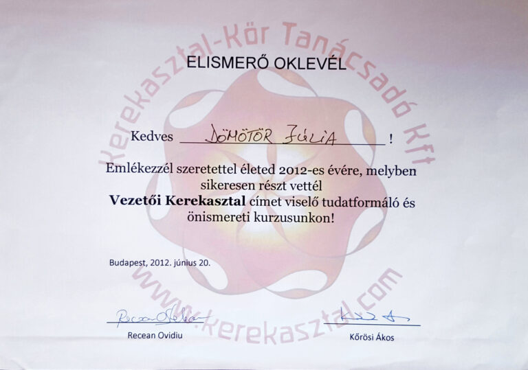 Ez a másoddiplomás képzés életem és személyes fejlődésem egyik meghatározó mérföldköve volt. Az önismereti gyakorlatok elképesztő mélységekbe vittek, a technikák darabokra szedtek – ami igen csak rossz, elveszett érzés volt hónapokig – majd lépésről lépésre raktam össze új énemet. Mire ide eljutottam, egy nyugodt, mély tónak éreztem magam és megtanultam az értő figyelmet. Óriási kincs.